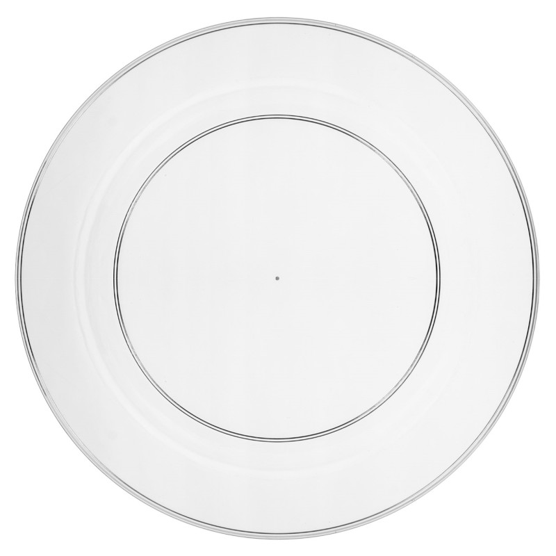 20 броя универсални чинии за хранене и сервиране, изработени от здрава прозрачна пластмаса със сребрист кант.