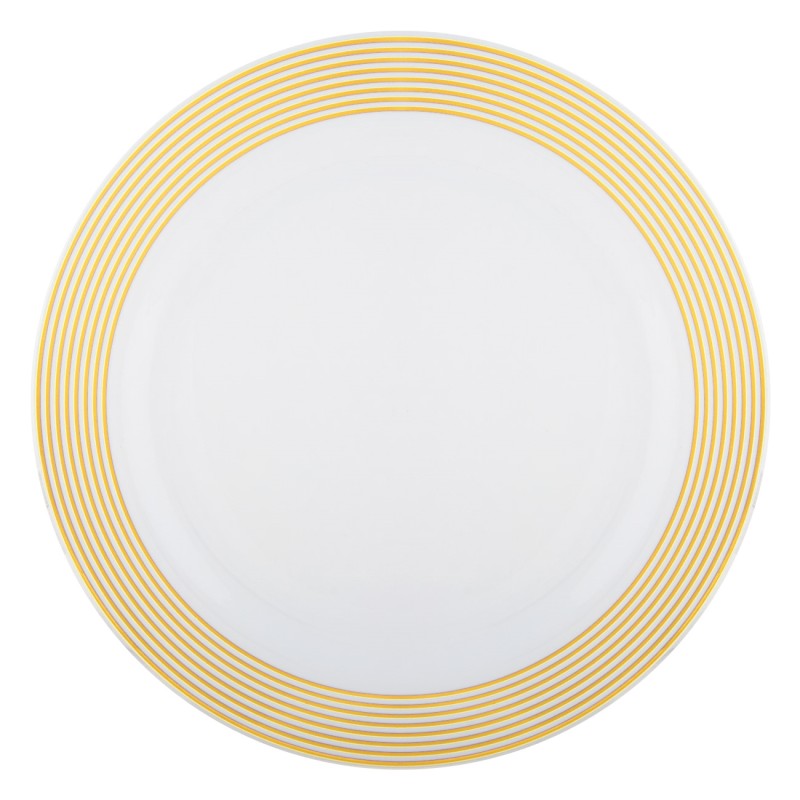 Комплект от 4 броя големи чинии за хранене и сервиране, изработени от плътна пластмаса в бял цвят с рамка в златисто райе.