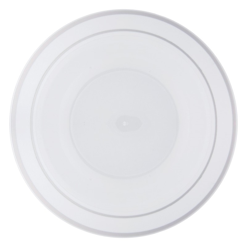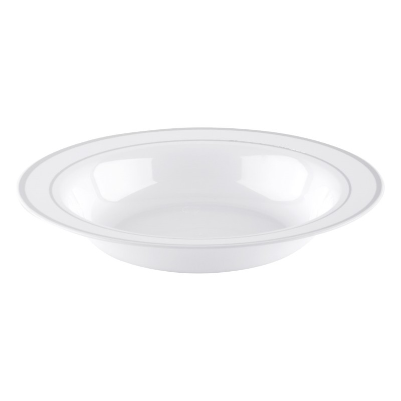 Комплект от 4 броя дълбоки чинии за хранене и сервиране, изработени от здрава пластмаса в бял цвят със сребрист завършек.