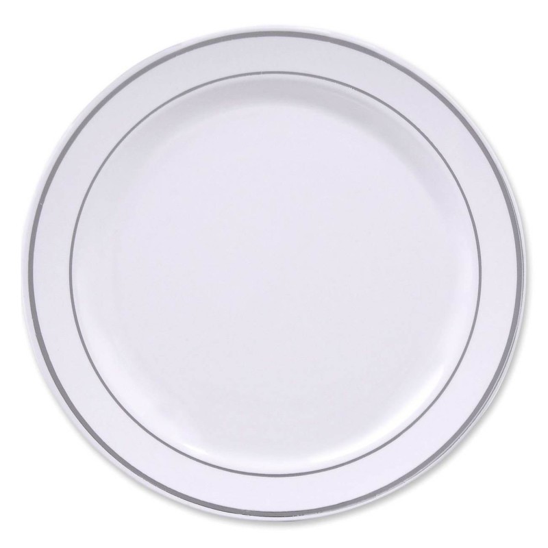 Комплект от 4 броя универсални чинии за хранене и сервиране, изработени от здрава пластмаса в бял цвят със сребрист завършек.