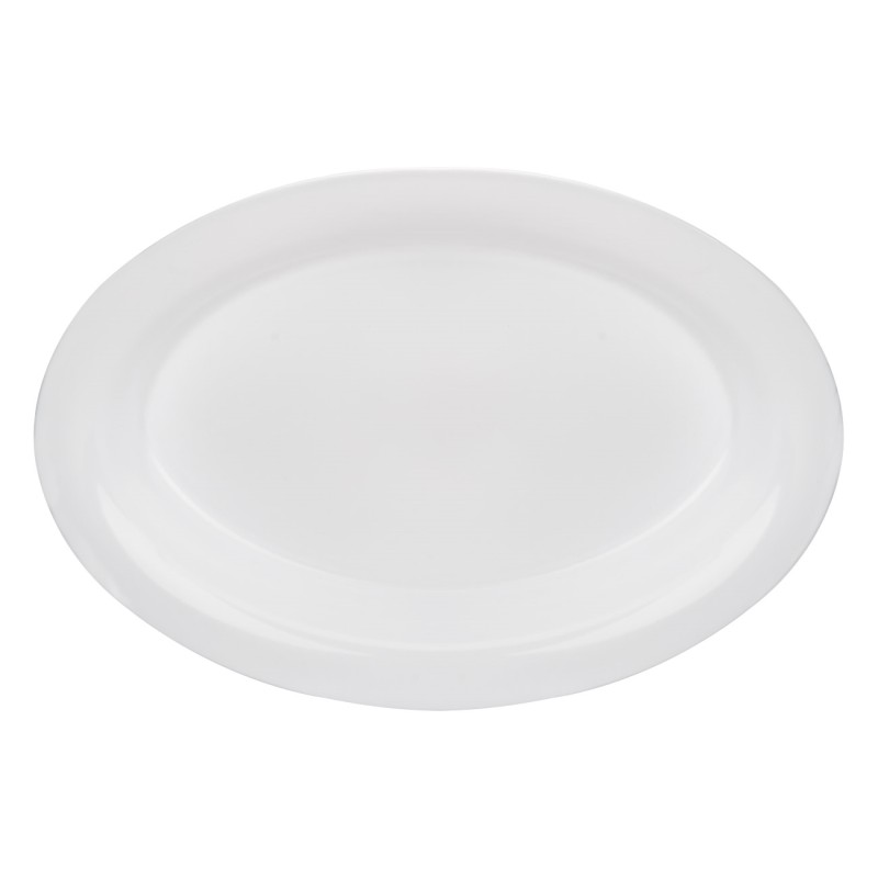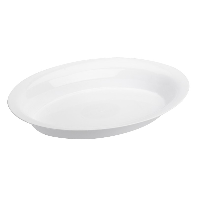 Дълбока елипсовидна чиния за хранене и сервиране, изработена от здрава и устойчива пластмаса в бял цвят.