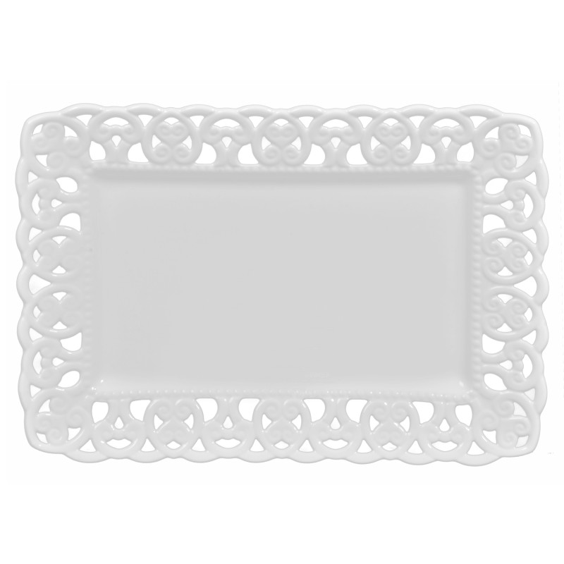 Правоъгълна чиния, изработена от висококачествен порцелан в бял цвят с красива дантелена рамка.