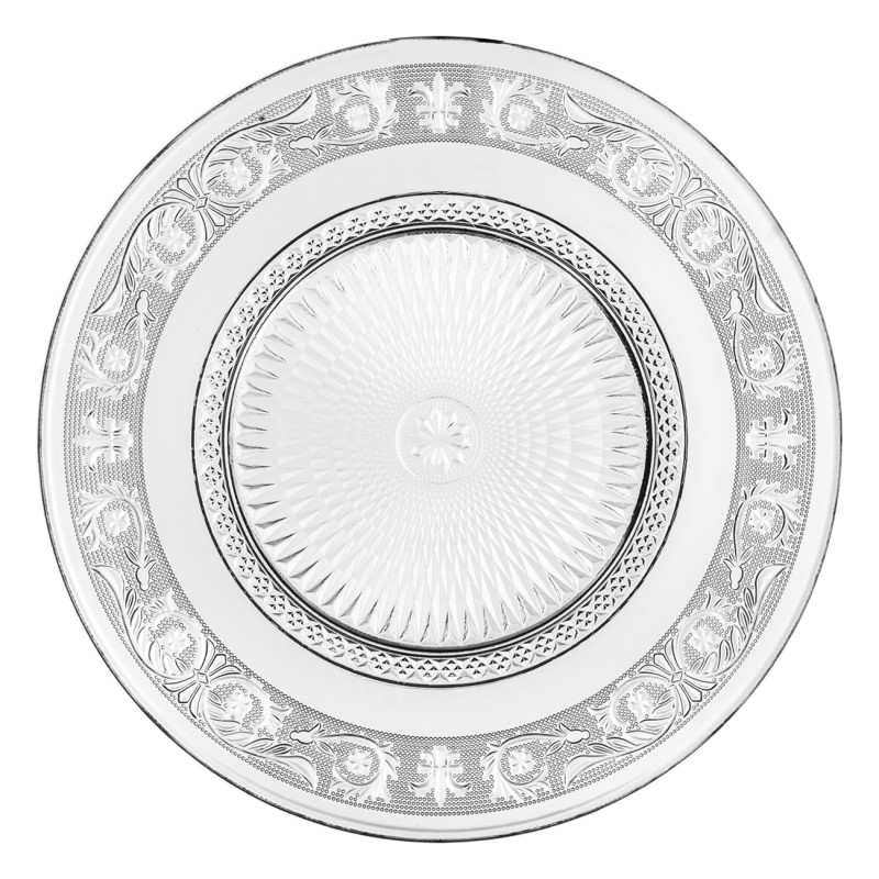 Универсална чиния за сервиране и хранене, изработена от висококачествено прозрачно стъкло с релефни флорални орнаменти.
