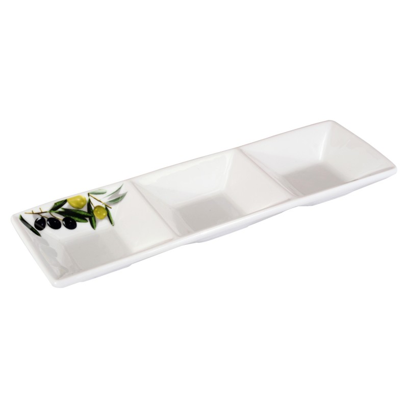 Продълговата чиния за маслини, изработена от висококачествен порцелан в бял цвят с 3 отделения и тематична щампа.
