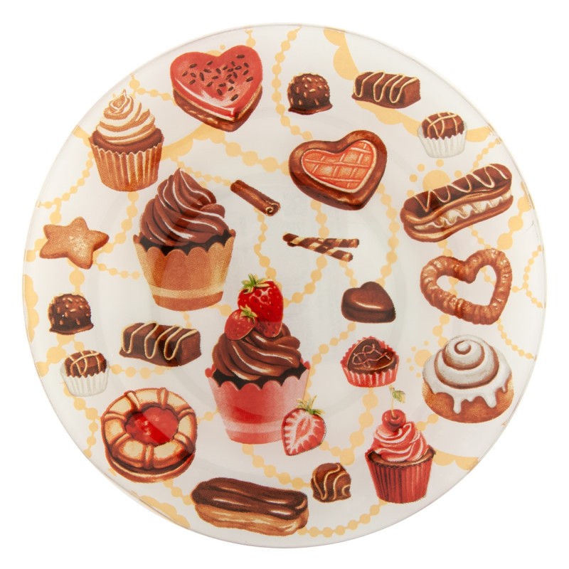 Десертна чиния, изработена от висококачествено стъкло с цветна щампа на различни сладкиши.