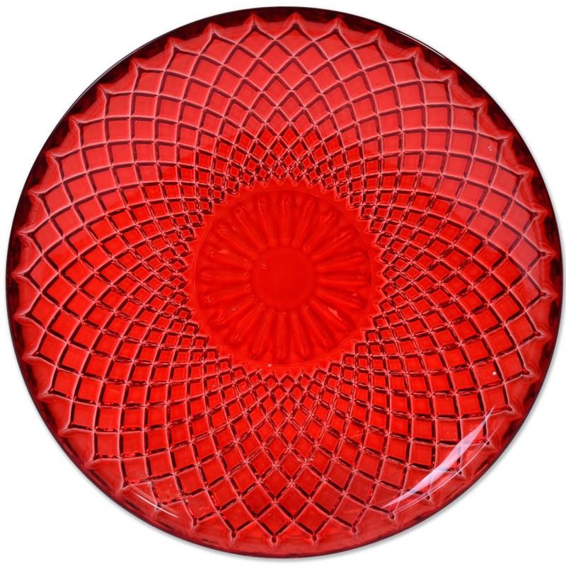 Десертна чиния, изработена от висококачествено стъкло в червен цвят с релефни ромбоидни шарки.