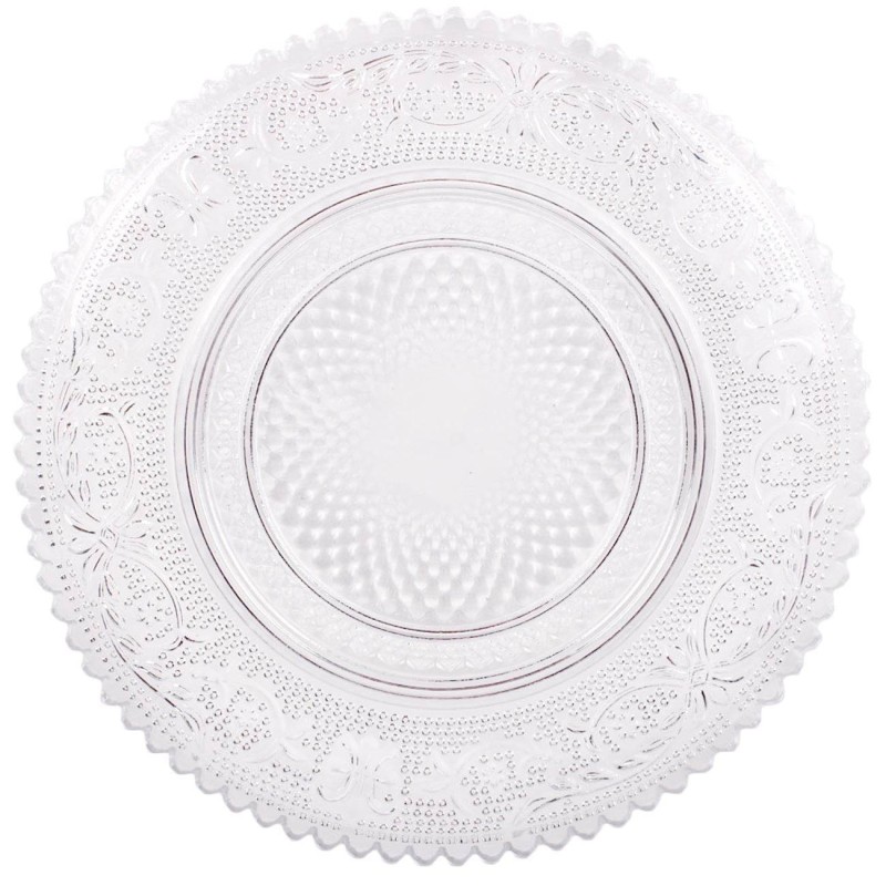 Десертна чиния, изработена от висококачествено прозрачно стъкло с релефни флорални орнаменти и вълнообразен ръб.