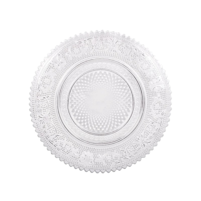 Десертна, изработена от висококачествено прозрачно стъкло с красиви релефни орнаменти на флорална тематика и вълнообразен ръб.