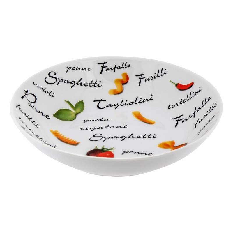 Дълбока чиния за паста, изработена от висококачествен порцелан в бял цвят с цветна щампа на макарони и зеленчуци и тематични надписи.