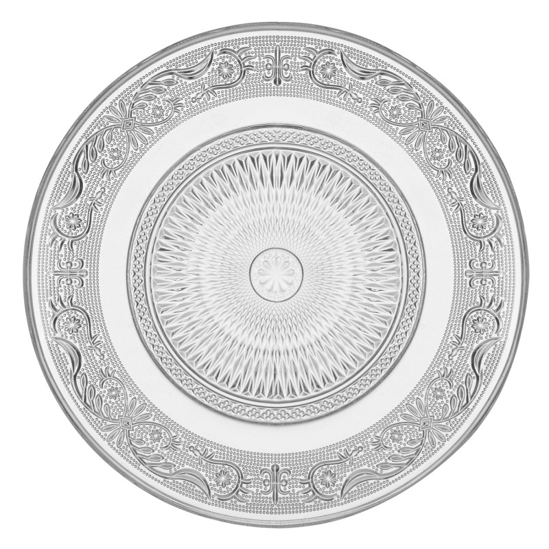 Чиния за основно ястие, изработена от висококачествено прозрачно стъкло с релефни флорални орнаменти.