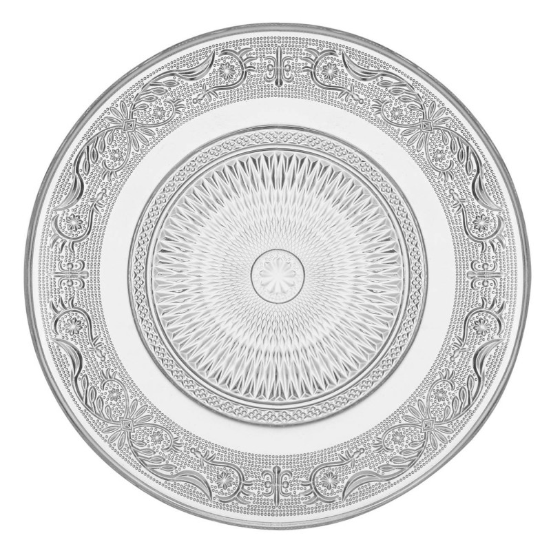 Чиния за плодове, изработена от висококачествено прозрачно стъкло с красиви релефни орнаменти на флорална тематика.