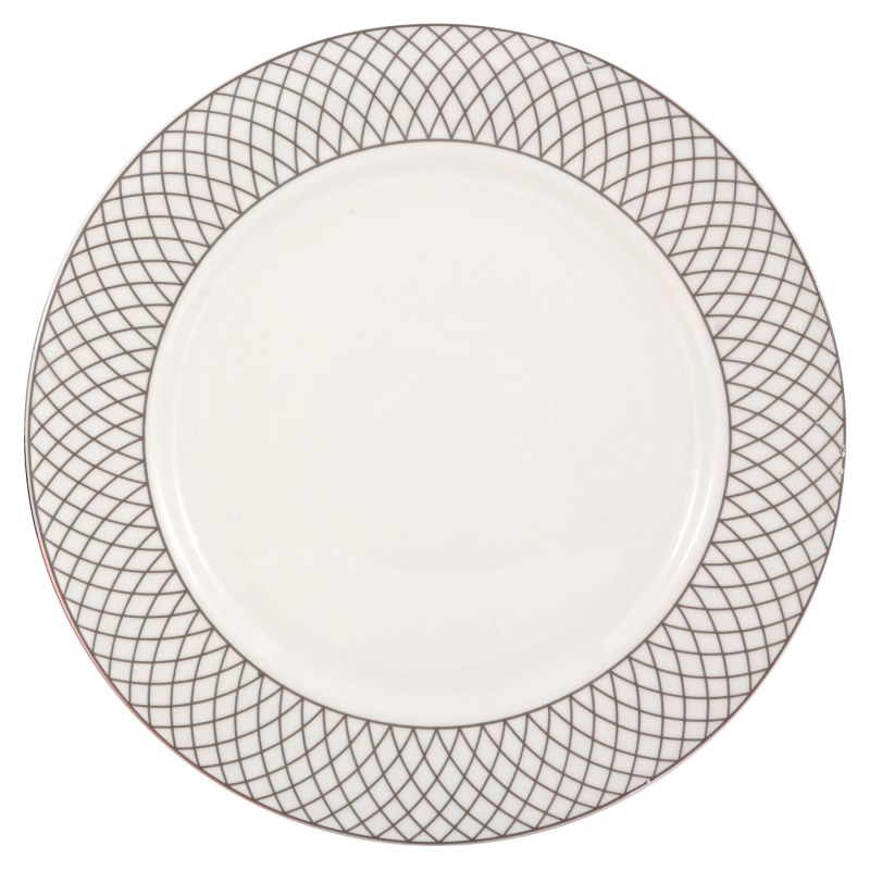 Чиния за основно ястие, изработена от висококачествен порцелан в бял цвят с рамка от кафяви ромбоиди.