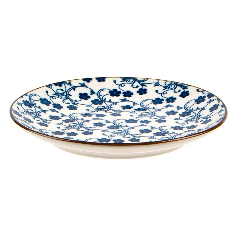 Чиния за сервиране и хранене, изработена от висококачествен порцелан в бял цвят с флорален принт на сини цветя.