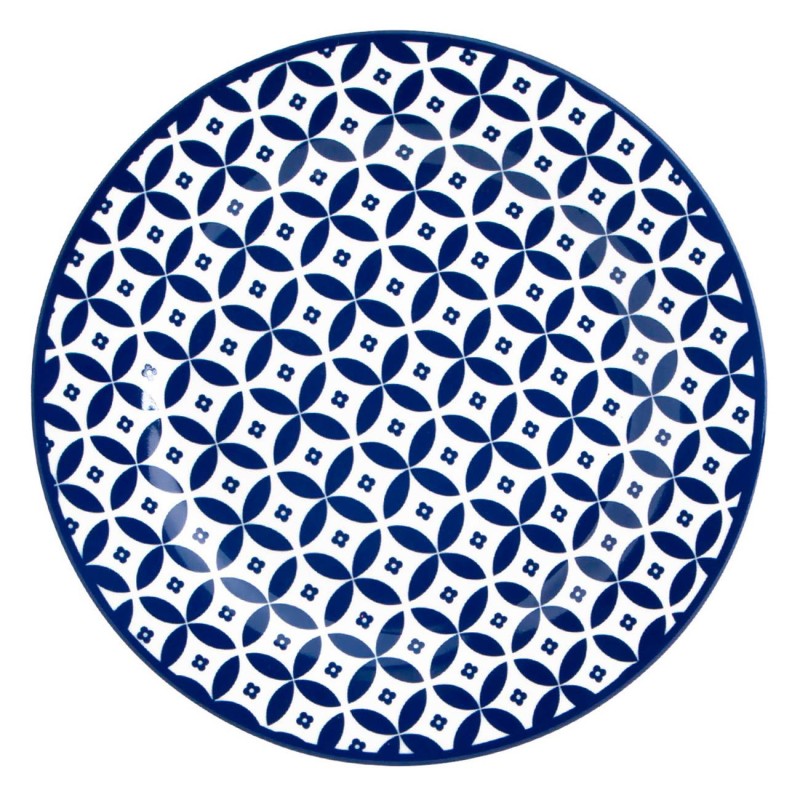 Чиния за сервиране и хранене, изработена от висококачествен порцелан със синьо-бели ромбоидни шарки.
