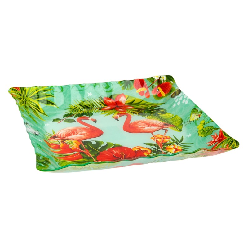 Чиния за хранене и сервиране в квадратна форма, изработена от висококачествено стъкло с красив принт на тропически цветя и розово фламинго.