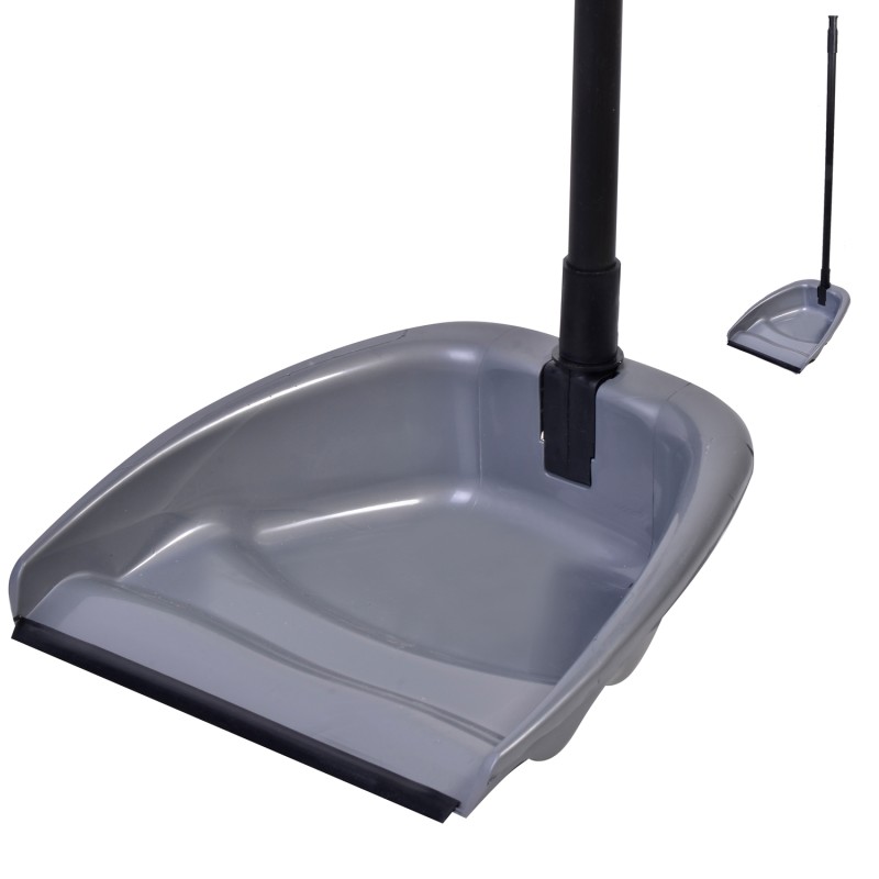 Пластмасова лопатка в сребрист цвят за почистване на под със специален гумиран накрайник за плътно прилепване към земята, широка релефна повърхност за задържане на отпадъците и удобна дълга дръжка за стабилен захват при употреба.