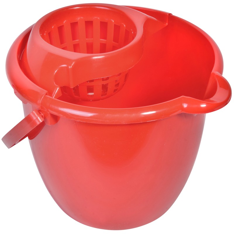 Пластмасова кофа за миене на под с цедка за изстискване на моп в изправено положение.