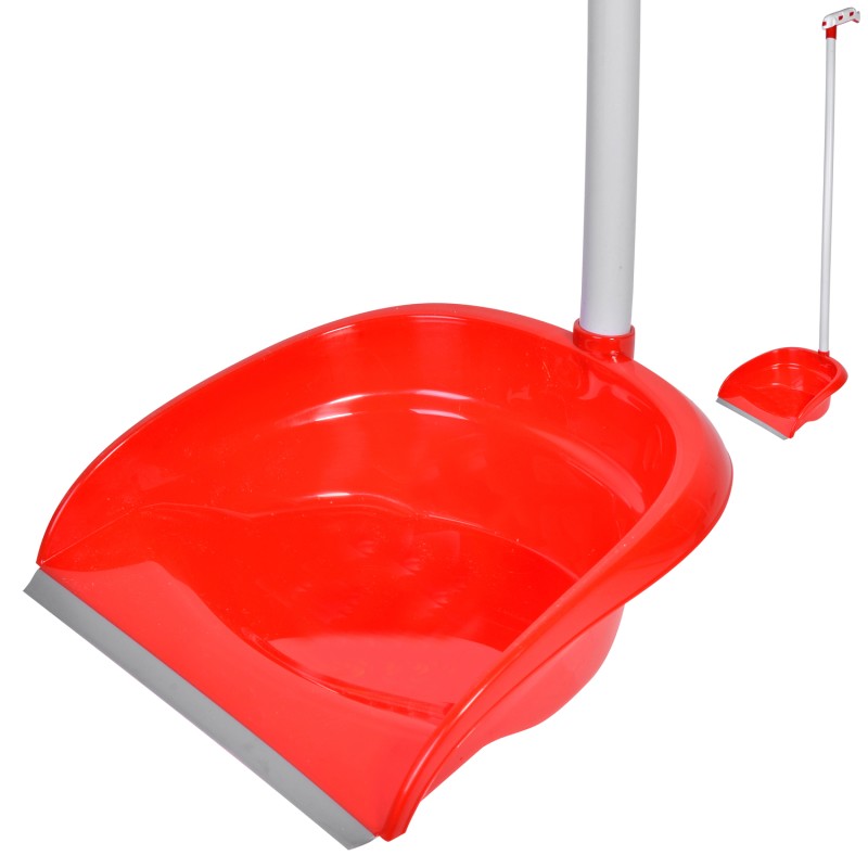 Пластмасова лопатка в червен цвят за почистване на под със специална гумена лента, улесняваща смитането на боклука, широка релефна повърхност за задържане на отпадъците и удобна дълга дръжка с пластмасова ръкохватка за стабилен захват при употреба.