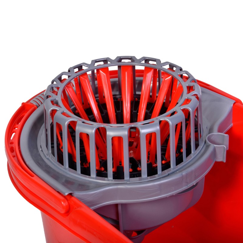 Мопът се изстисква лесно в цедката - без навеждане и без докосване на мръсната вода с ръце - само завъртете главата на мопа в приставката на цедката и изстискайте, като натиснете дръжката надолу.