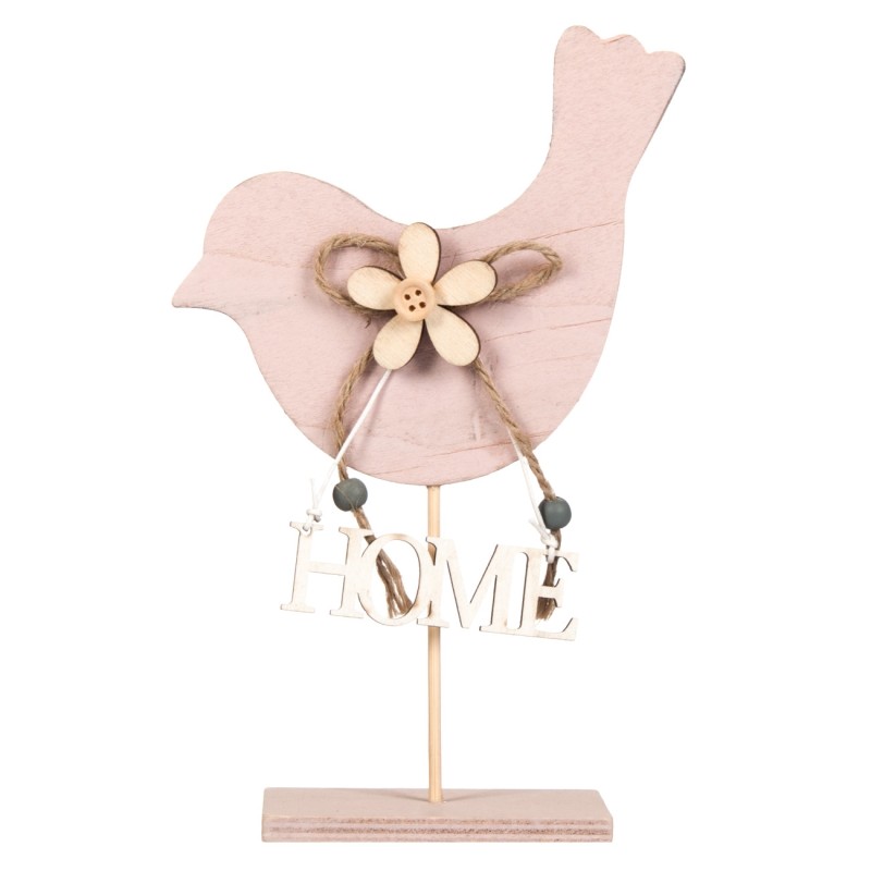 Настолна декорация във формата на птичка, изработена от дърво в розов цвят с дървено цвете и надпис HOME.