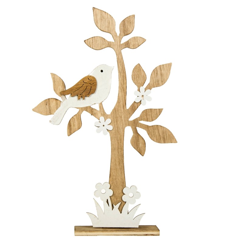 Настолна декорация, изработена от дървесина във формата на дърво с птичка и цветя.