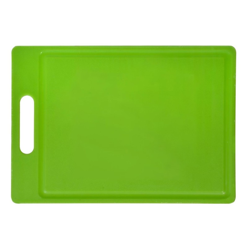 Универсална кухненска дъска за рязане, изработена от висококачествена гъвкава пластмаса в зелен цвят, устойчива на механични въздействия с практичен улей за отцеждане.