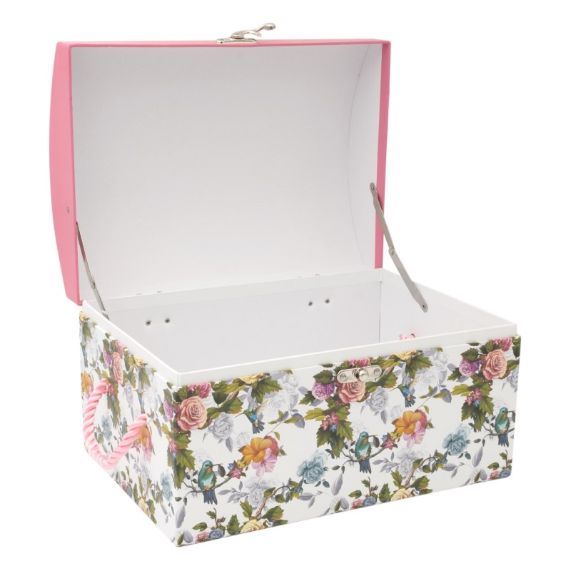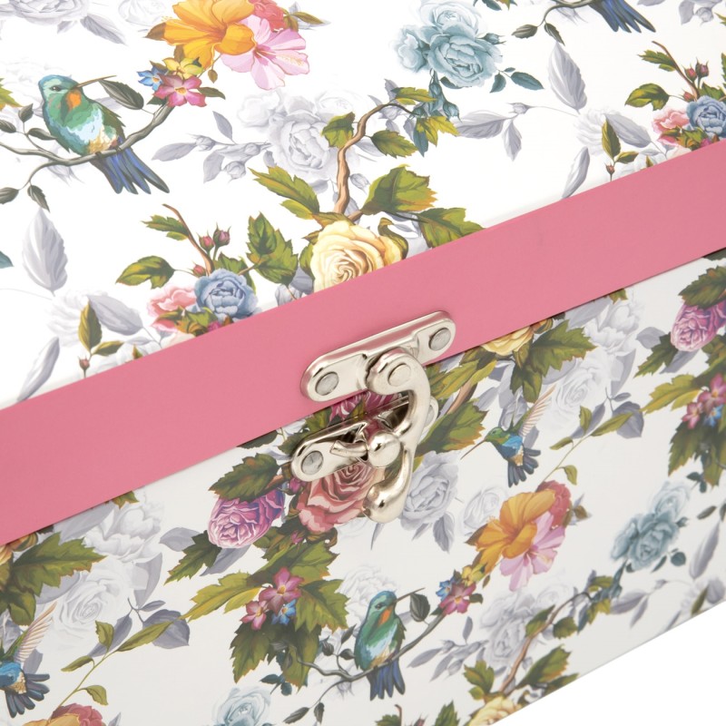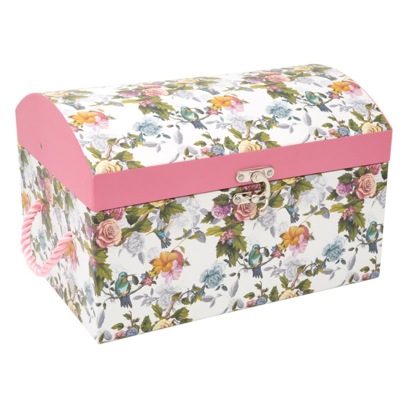 Голяма декоративна кутия за съхранение, изработена от пресован картон с красив флорален принт и метална закопчалка.