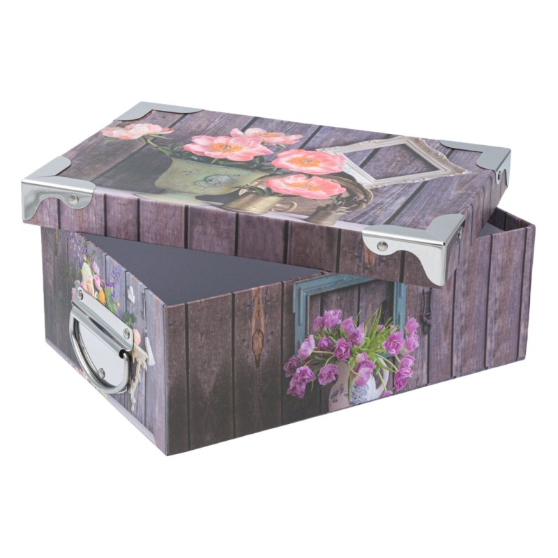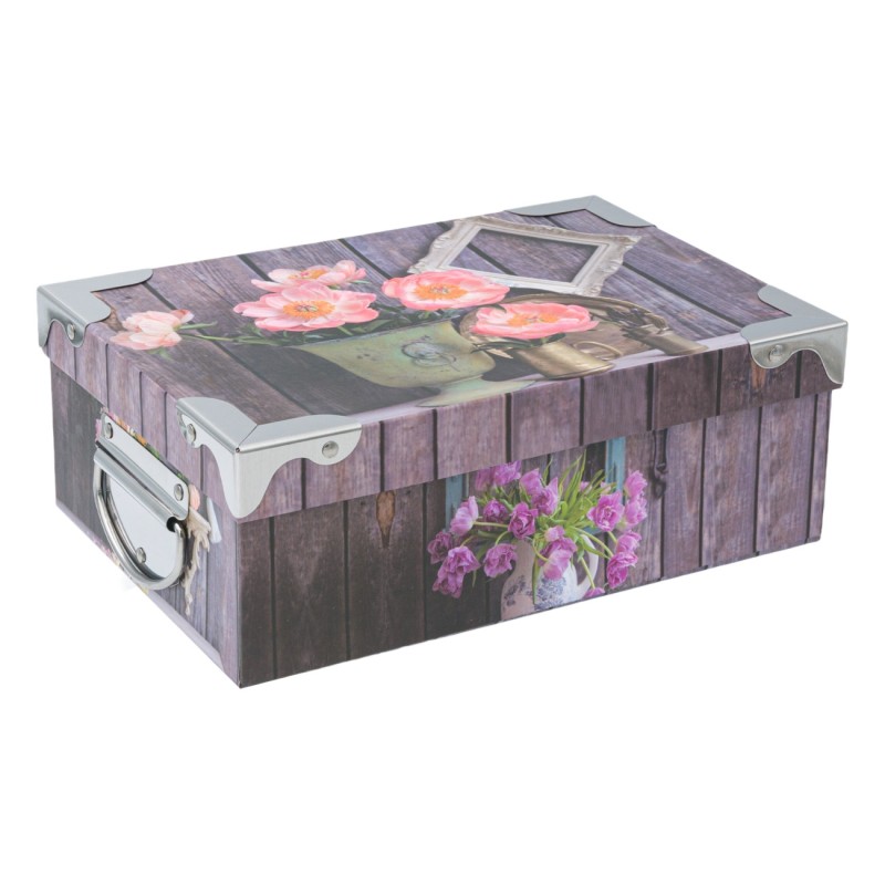 Кутия за съхранение с правоъгълна форма, изработена от висококачествен пресован картон с красива щампа на ваза с цветя, метални ъгли и дръжки.