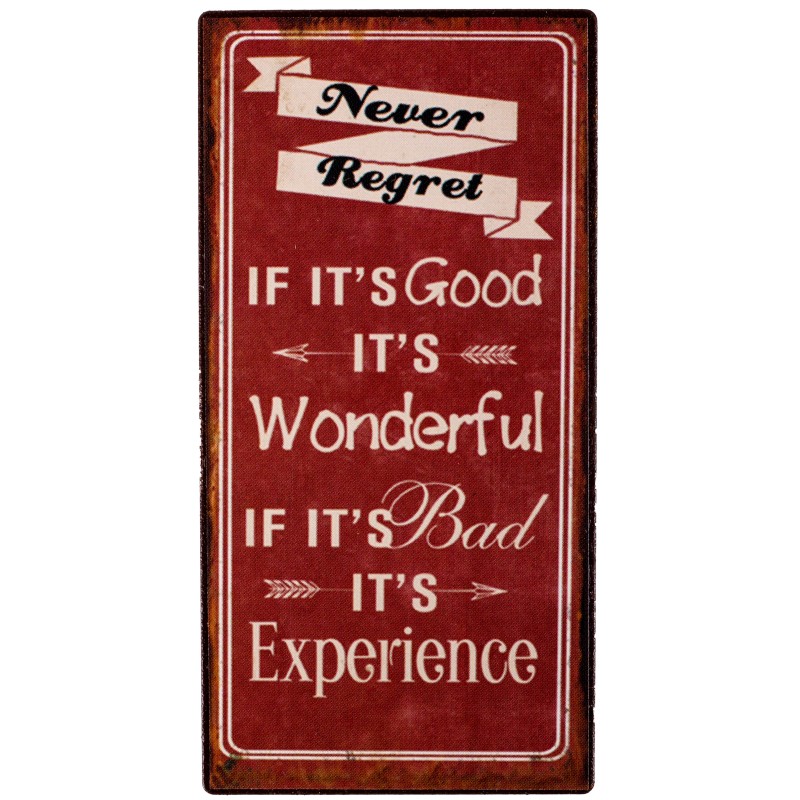 Метален магнит за декорация на хладилник, врати или други метални повърхности в червен цвят с правоъгълна форма с надпис Never regret.