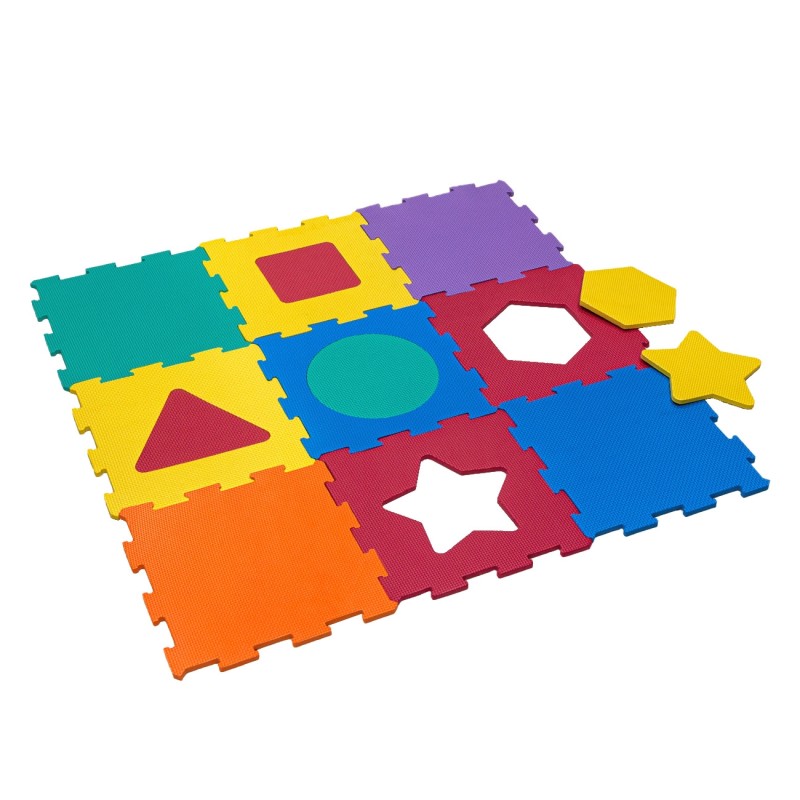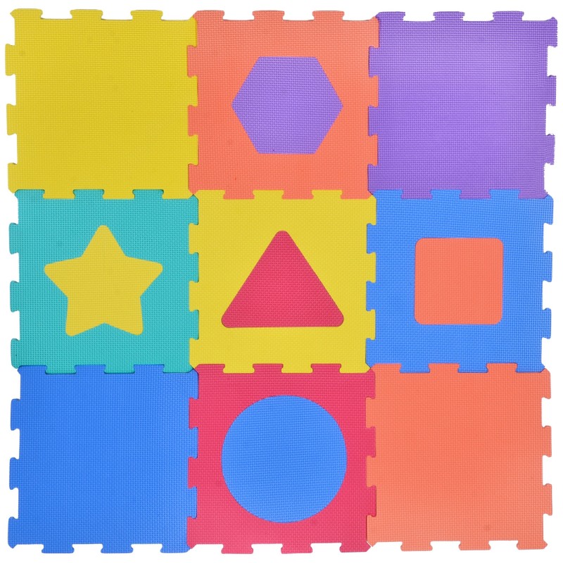Декоративна постелка тип пъзел от 9 части с различни геометрични фигури, изработени от висококачествен EVA материал в ярки цветове, които се сглобяват бързо и лесно.