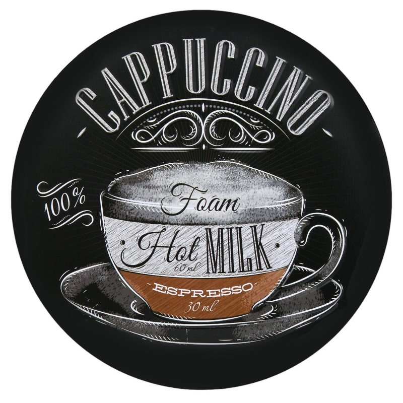 Кръгла декоративна табела, изработена от метал в черен цвят с щампа на чаша капучино.