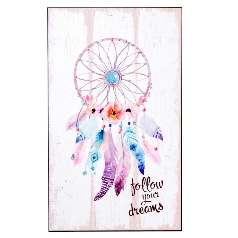 Декоративна табела, изработена от дърво с позитивен надпис Follow your dreams и картинка на индианския талисман Ловец на сънища.