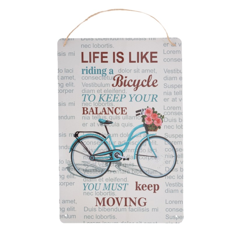 Декоративна табела, изработена от метал с позитивен надпис и винтидж щампа на велосипед.