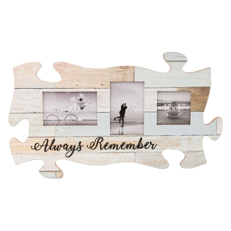 Декоративна табела във формата на парче от пъзел в бежово-сиви нюанси, изработена от дърво с надпис Always remember и вградена рамка за 3 снимки - 2 с размер 10 х 15 см. и 1 с размер 10 х 10 см.
