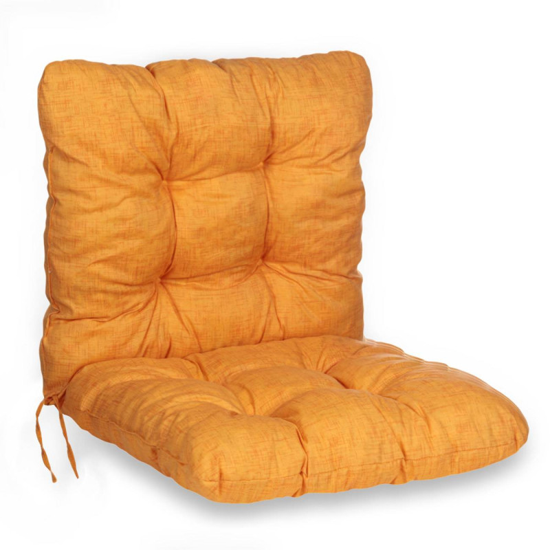 Декоративна възглавница за стол на открито с облегалка, в цвят горчица, двустранна, без цип, с шнурове от същата материя за завързване към седалката.