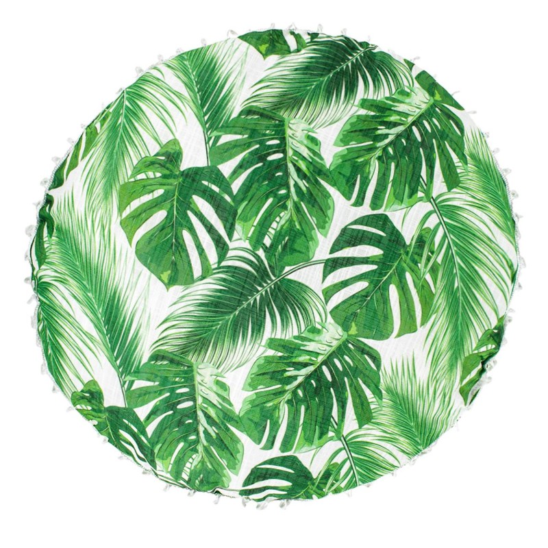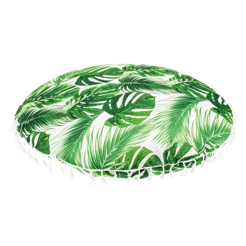 Кръгла възглавница за под с дизайн на тропически листа и плетка с бели пискюли по периметъра.