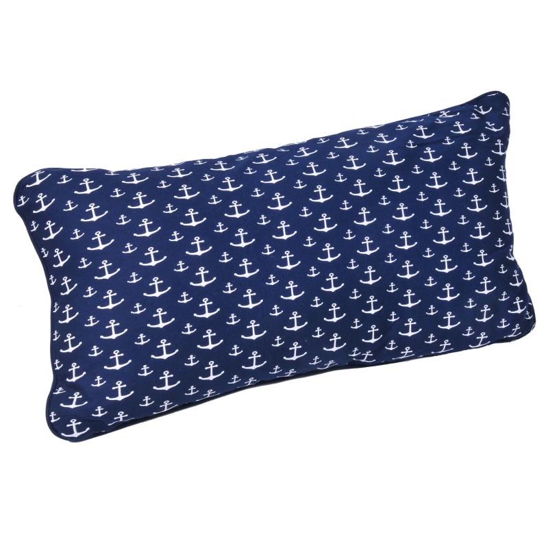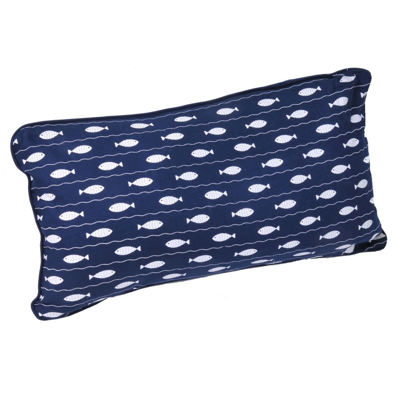 Правоъгълна декоративна възглавница с две лица, изработена от полиестер в тъмно син цвят с принт на котви и риби и цип.