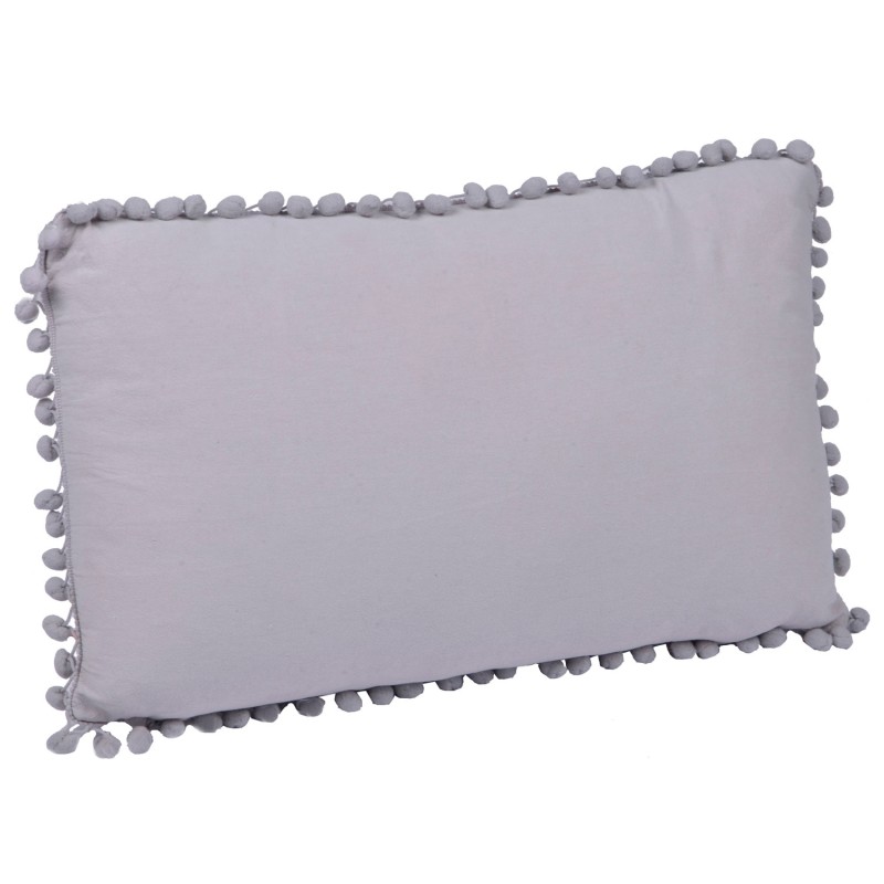 Правоъгълна декоративна възглавница, изработена от памук в сив цвят с рамка от декоративни помпони.
