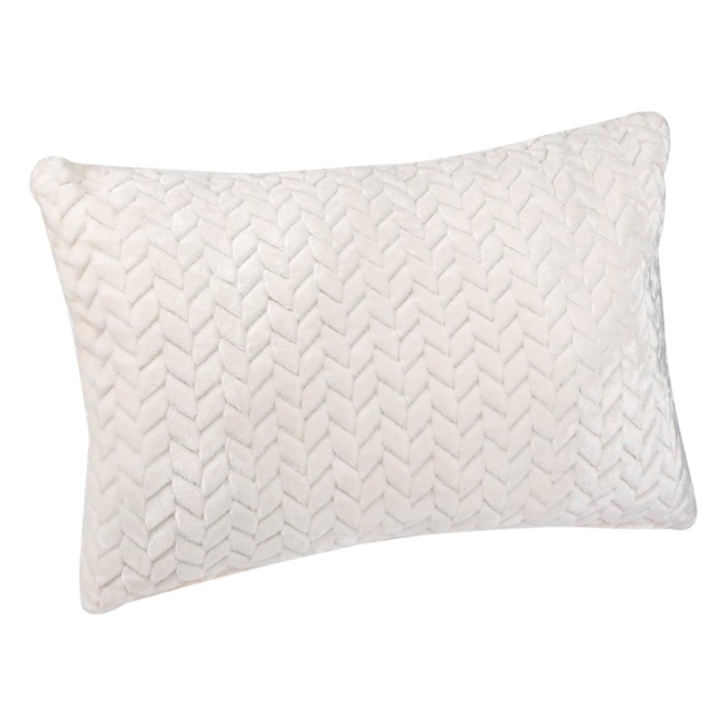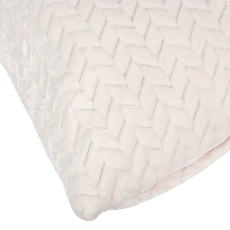 Декоративна възглавница с правоъгълна форма, изработена от полиестер в цвят екрю със стилни шарки, имитиращи плетка и цип за лесно почистване.