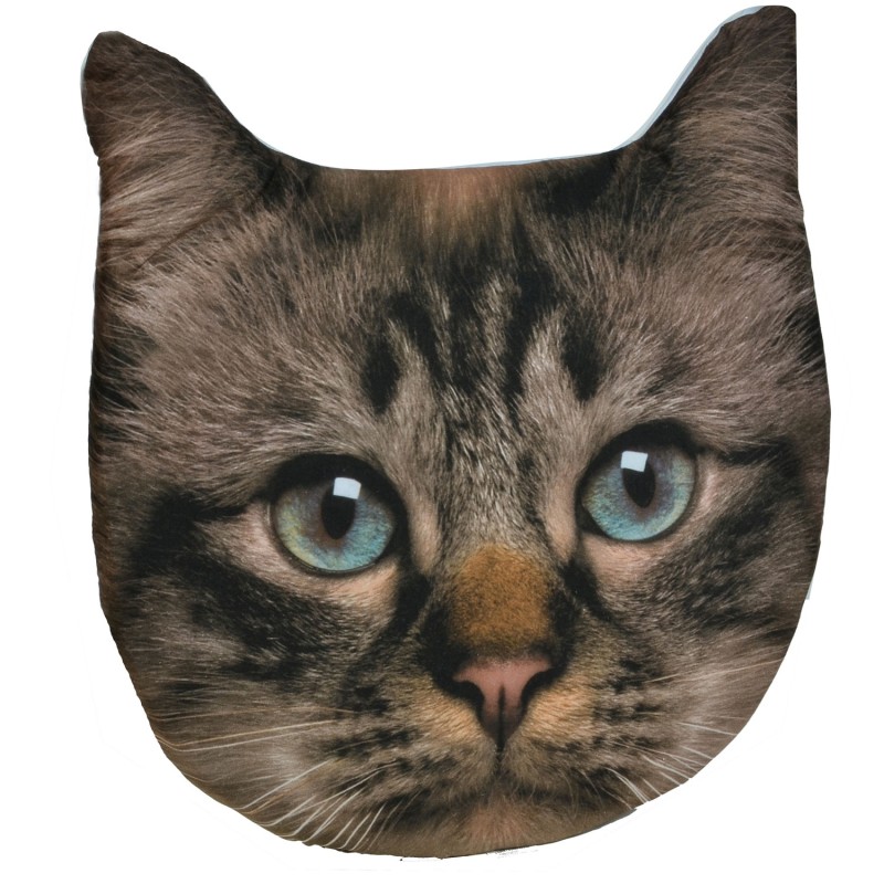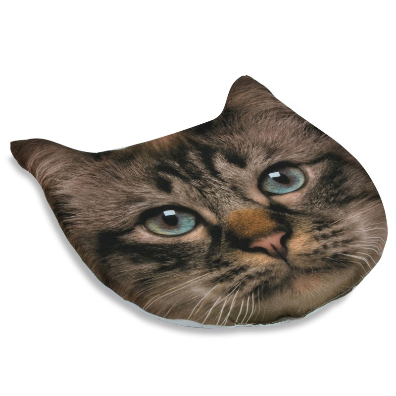 Декоративна възглавница за стол в формата на глава на котка, изработена от полиестер в кафяви нюанси.