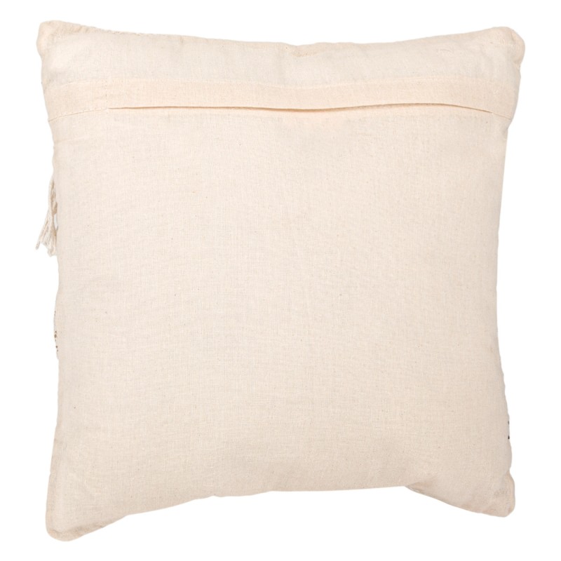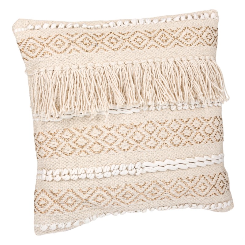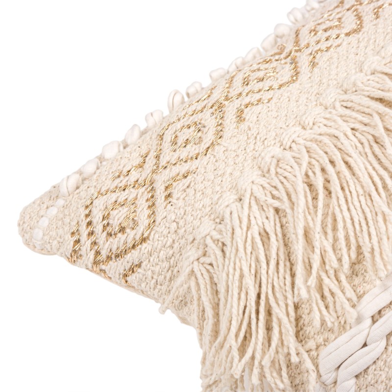Квадратна декоративна възглавница с цип, изработена от памук с дантелени шарки и ресни в цвят екрю.