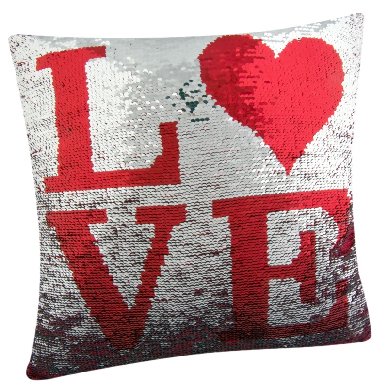 Квадратна декоративна възглавница, изработена от полиестер с магически пайети и надпис LOVE в червено и сребристо.