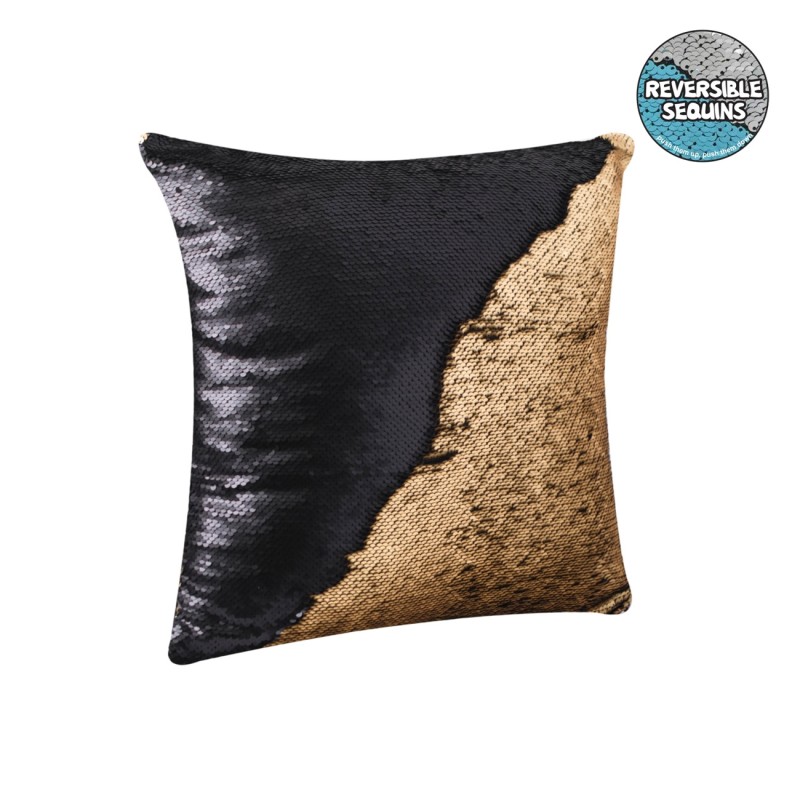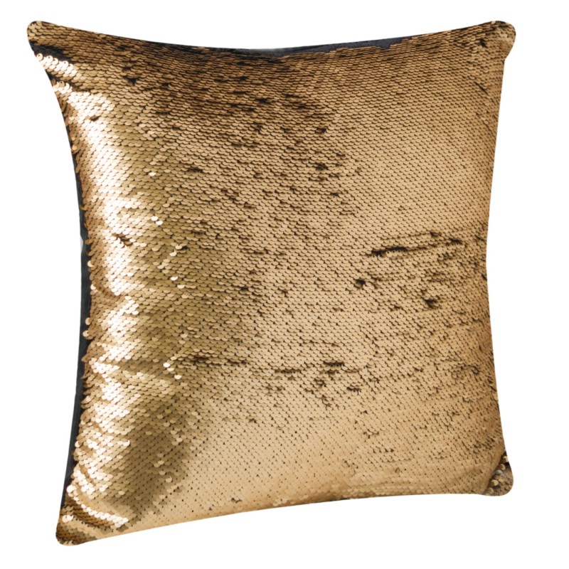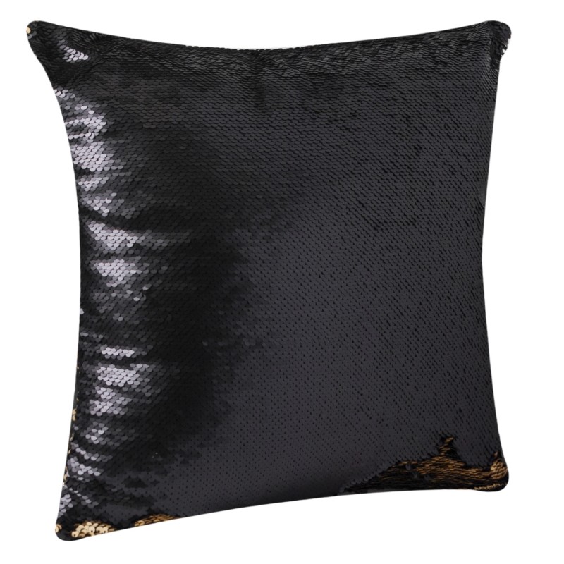 Квадратна декоративна възглавница, изработена от полиестер с магически пайети в черно и златисто.