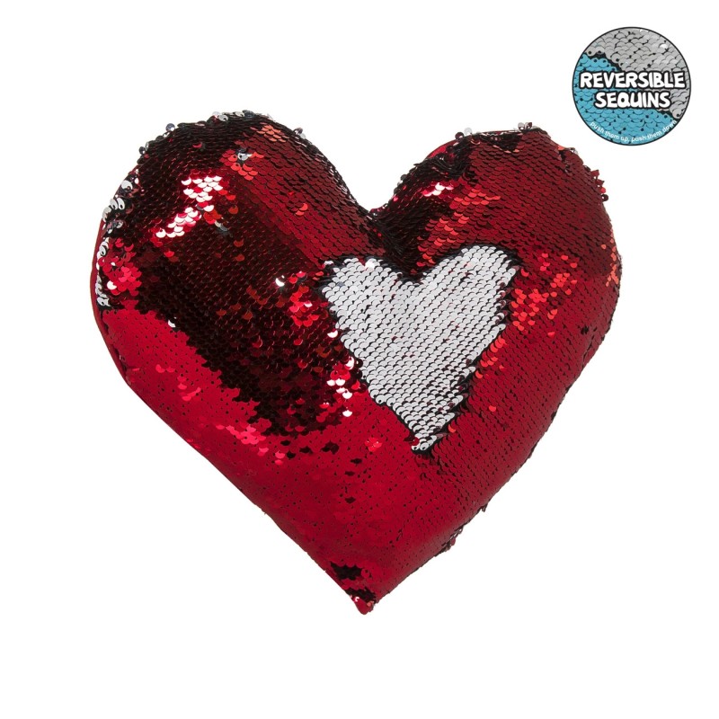 Декоративна възглавница във формата на сърце, изработена от полиестер с магически пайети в червено и сребристо.