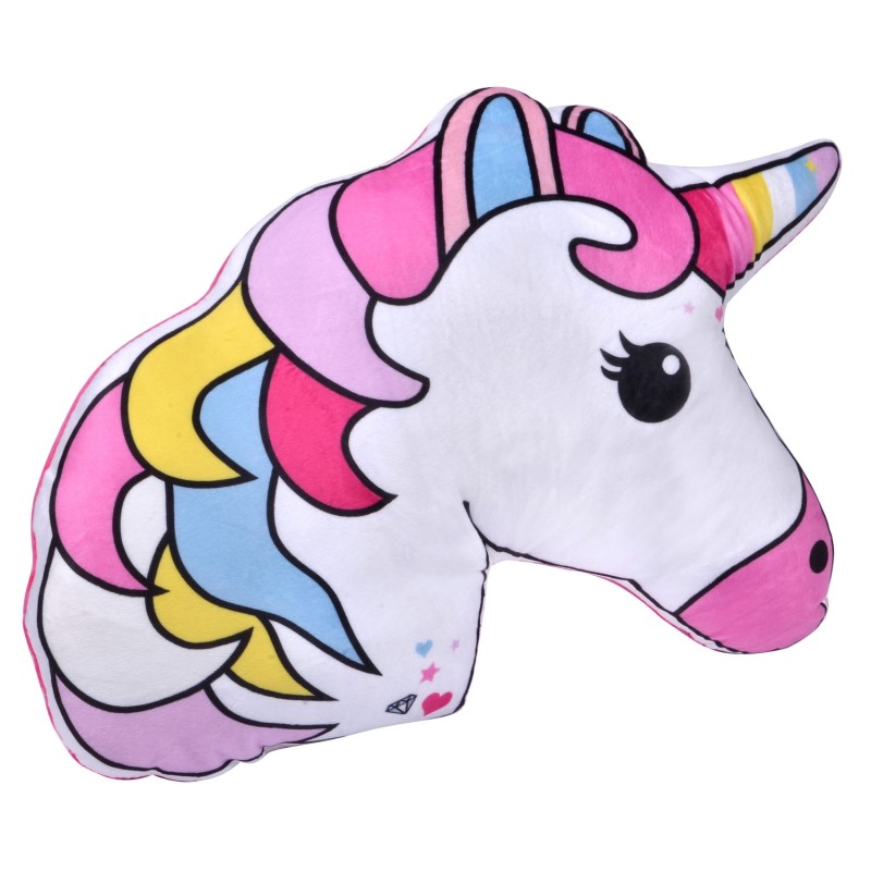 Декоративна възглавница във формата на глава на еднорог, изработена от полиестер в ярки цветове.