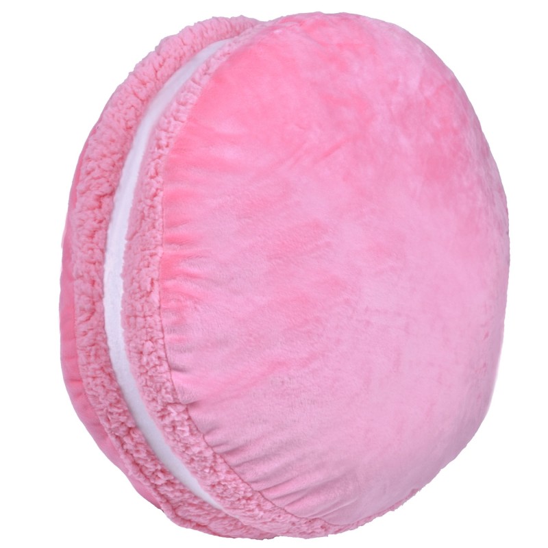 Декоративна възглавница във формата на френски макарон, изработена от полиестер в розов цвят.