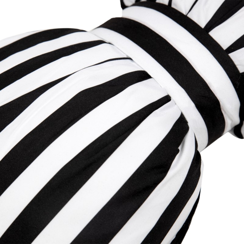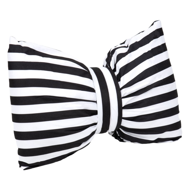 Декоративна възглавница във формата на глава на папийонка, изработена от полиестер в черно-бяло райе.