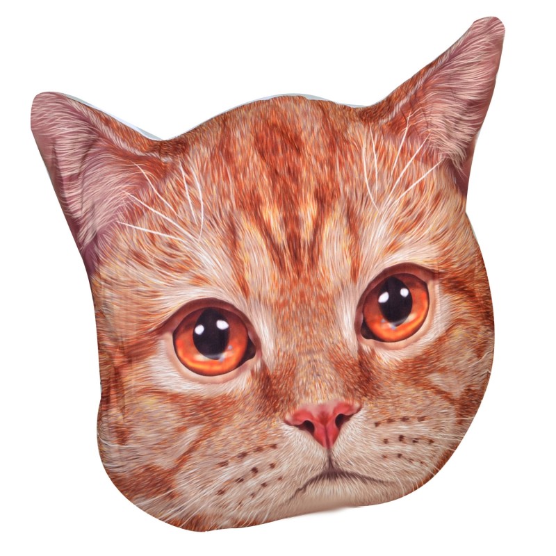 Декоративна възглавница във формата на глава на котка, изработена от полиестер в реалистични цветове.