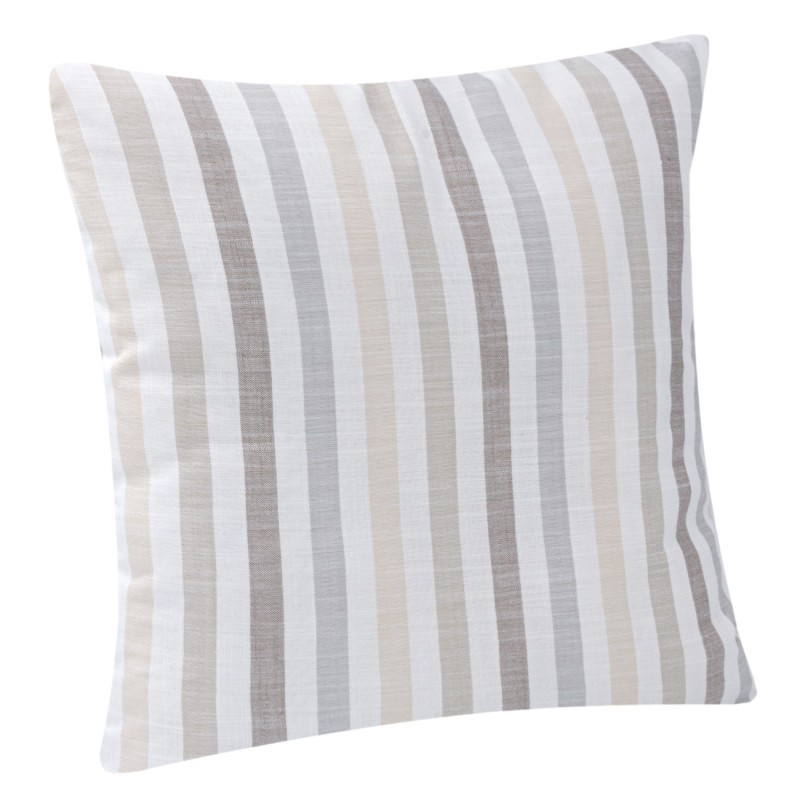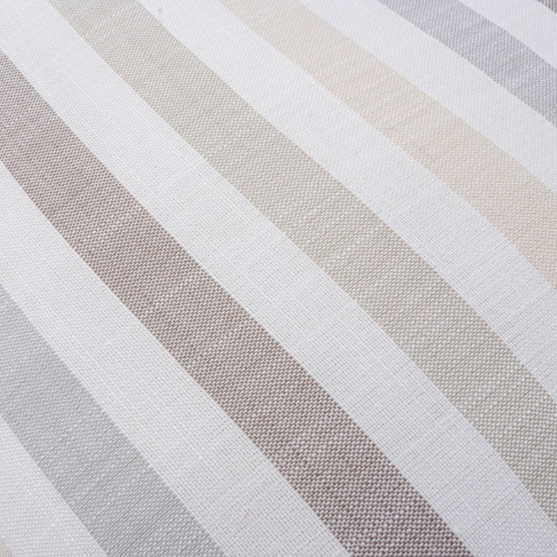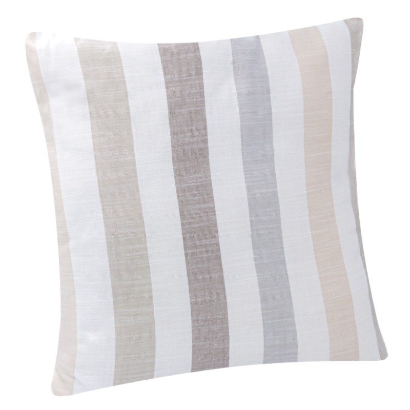 Квадратна декоративна възглавница с цип, изработена от полиестер и лен в бежово-бяло райе.