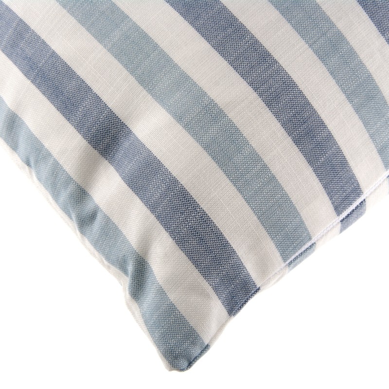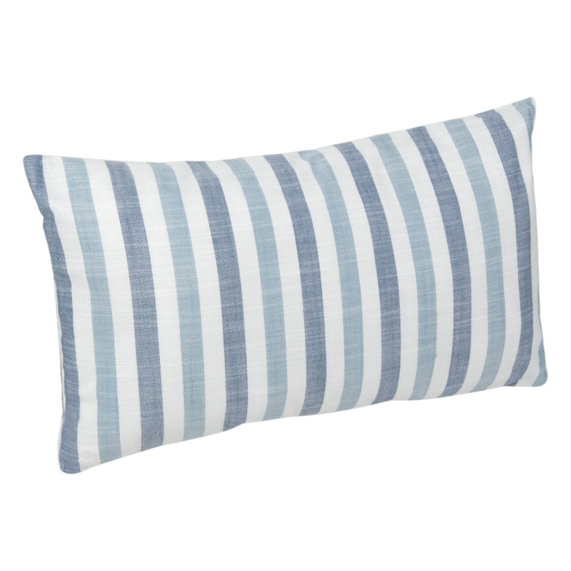 Правоъгълна декоративна възглавница, изработена от полиестер и лен в синьо-бяло райе.